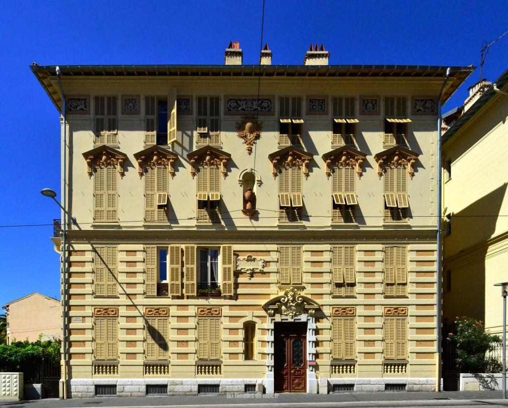 Immeuble trés caractéristique des construction de Nice avec son toit à 4 pentes et ses peintures sous celui-ci.